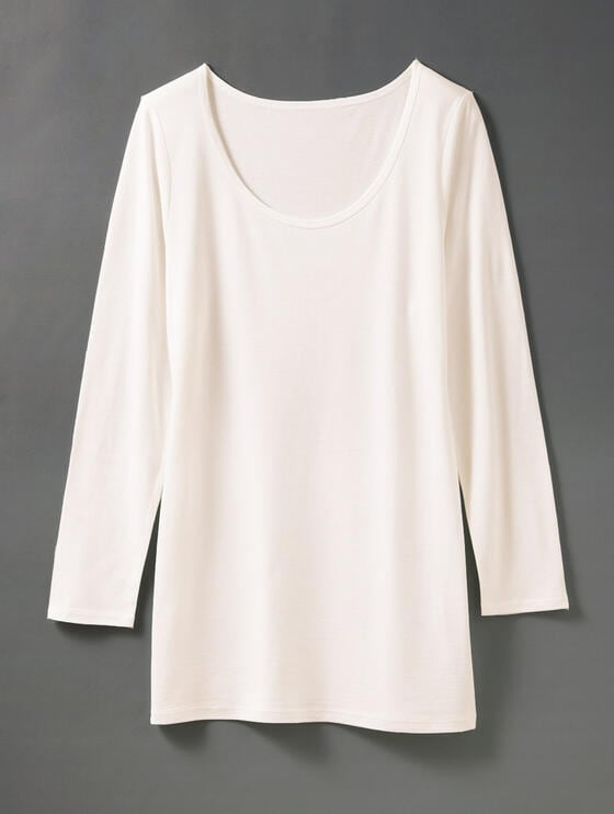 ◆ 胸元は、アウターに響かないすっきりしたカーブのデザイン。腰どまりのちょうど良い丈感で、ほどよくボディラインに添います。すっきり、シンプル な8分袖インナーです。